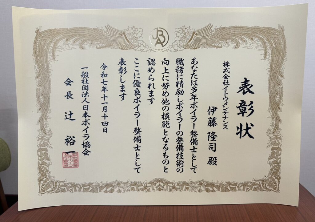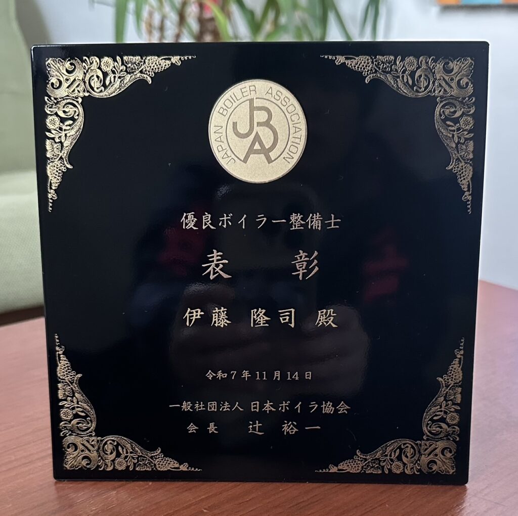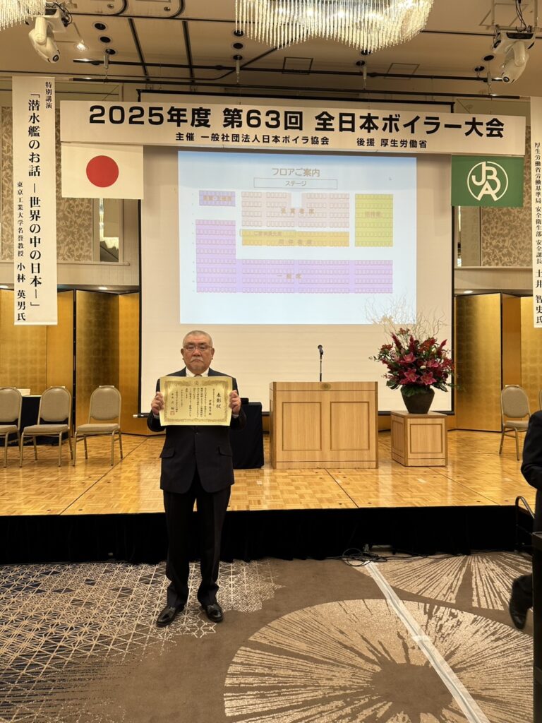 令和3年に続き、令和7年11月14日東京浅草ビューホテルで、優良ボイラー整備士の全国表彰を受けました。